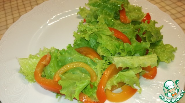 Болгарский перец порезать длинными полосками и разложить поверх лисьев салата.
