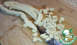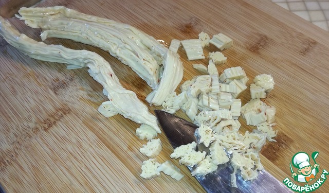 Морковь по-корейски нарезаем (по желанию) и отправляем в наш салат.