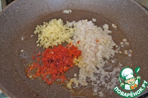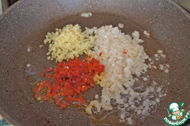 Мелкими кубиками нарезать острый перец без семечек, лук-шалот и очищенный от шкурки имбирь,
