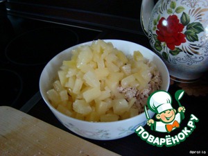 И, слив сок из баночки, добавляем кусочки ананаса в салат