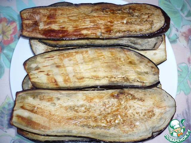 Срезав край с плодоножкой, баклажаны разрезать тонкими пластинами вдоль. Ломтики замочить в подсоленной воде примерно на полчаса. Через полчаса воду слить баклажаны обсушить. -