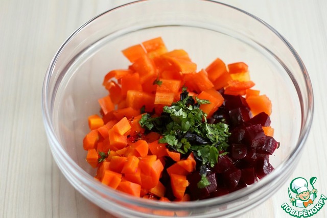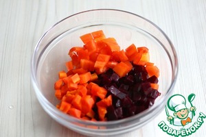 Морковь (1шт.) отварить, нарезать кубиками, болгарский перец (1 шт.) почистить, удалить семена, нарезать кубиками.