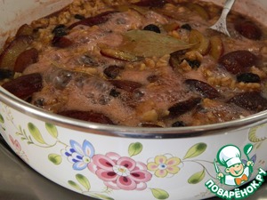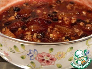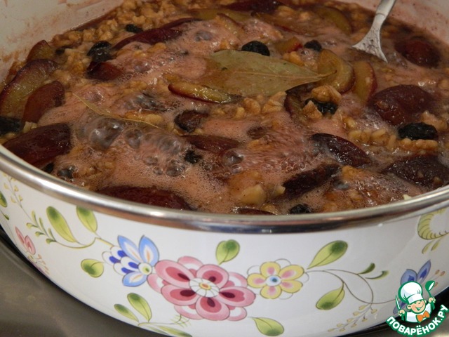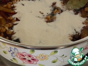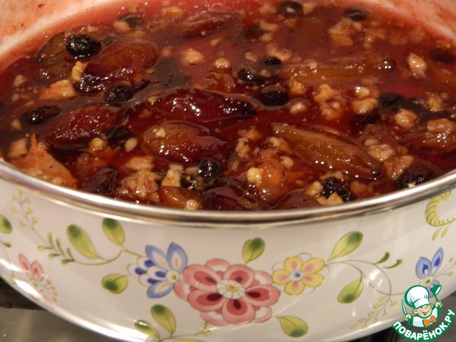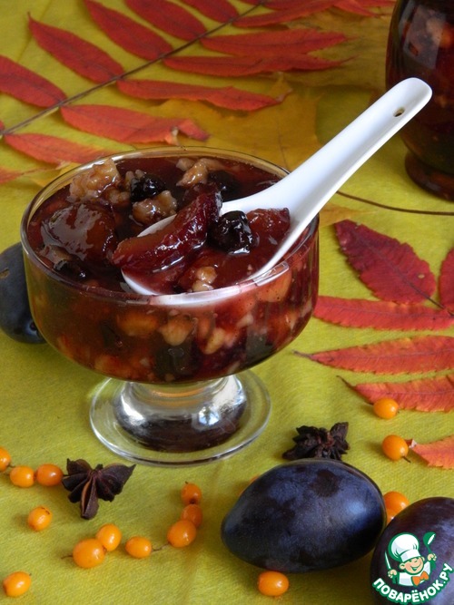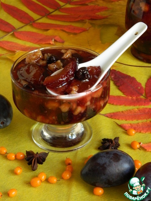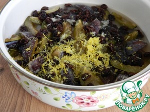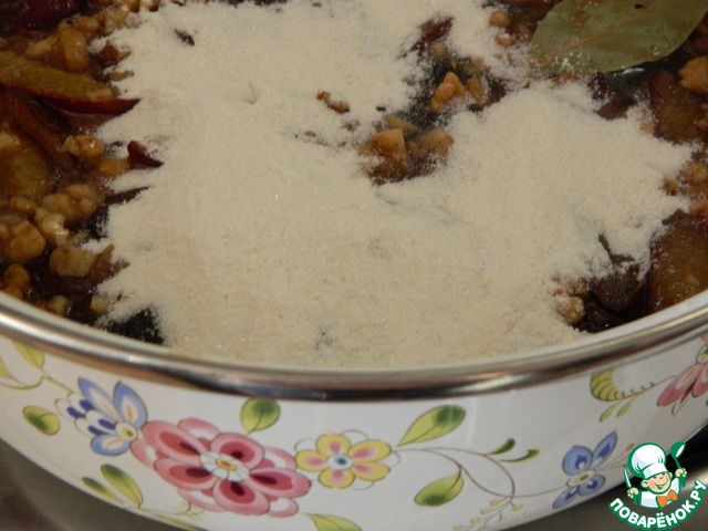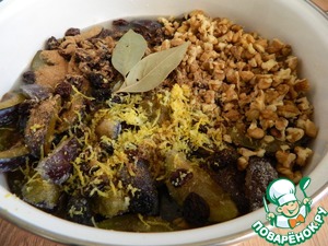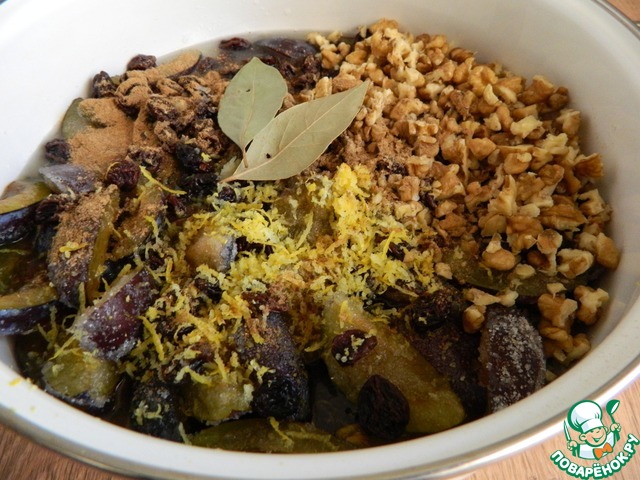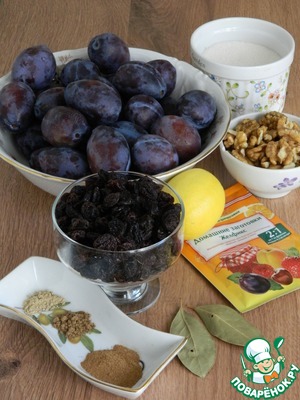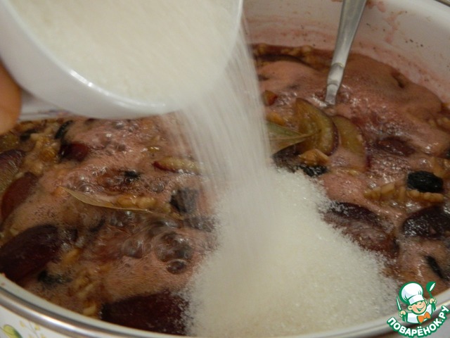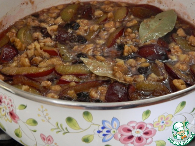 Добавим изюм, орехи, прянности и лавровый лист к сливам.