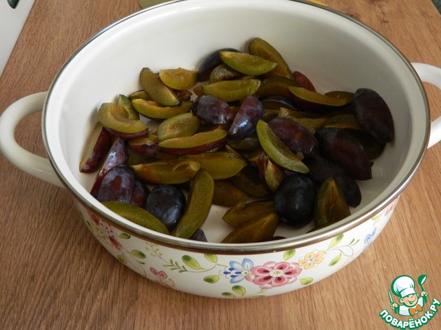 Сливы вымоем, разрежем на 4 части, извлечем косточки.