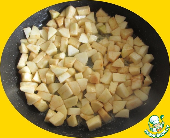 На сковороду выкладываем сливочное масло и высыпаем сахар, ставим на огонь, разогреваем до расплавления масла, всыпаем кубики яблок и помешивая тушим минут 10. Яблоки должны стать мягкими, но сохранить форму. Снимаем с огня, перекладываем в миску и оставляем до полного охлаждения.