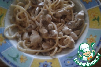 На тарелку выкладываем макароны, затем поливаем соусом, сверху натираем пармезан. Наше блюдо готово. Всем приятного аппетита.