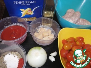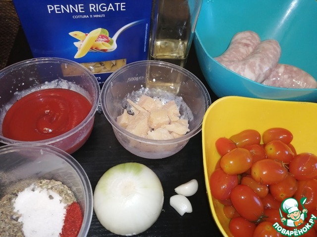 Ингредиенты для «Ригатони с колбасками и томатным соусом»: