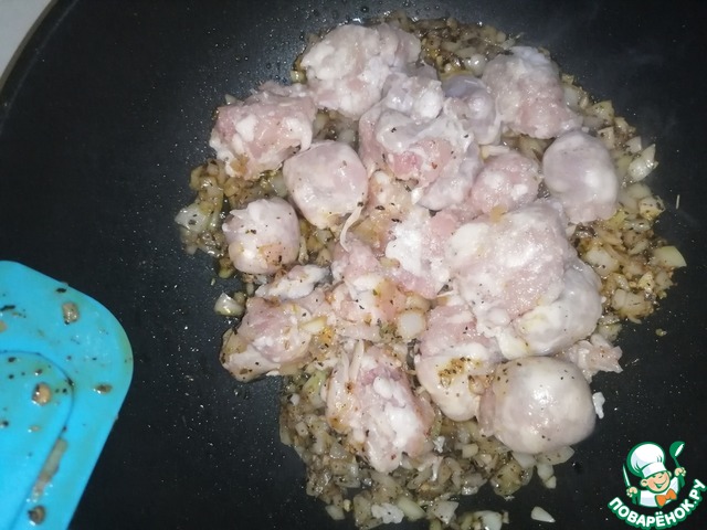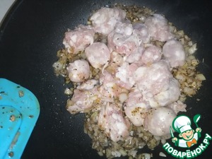 Ставим глубокую сковородку на средний огонь. Добавляем немного масла растительного и выкладываем соль со специями, немного обжариваем, постоянно помешивая и добавляем лук с чесноком. Необходимо обжаривать до золотистого цвета, затем добавляем колбаски.