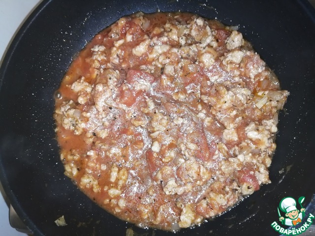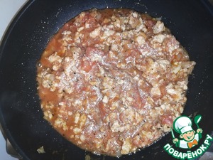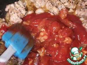 Обжариваем еще пару минут и прибавляем томаты, размягчаем их с помощью вилки и перемешиваем с ингредиентами. затем добавляем томатную пасту и пол бокала вина, все перемешиваем и даем немного настояться, чтобы выпарить алкоголь и придать соусу более густой вид.
