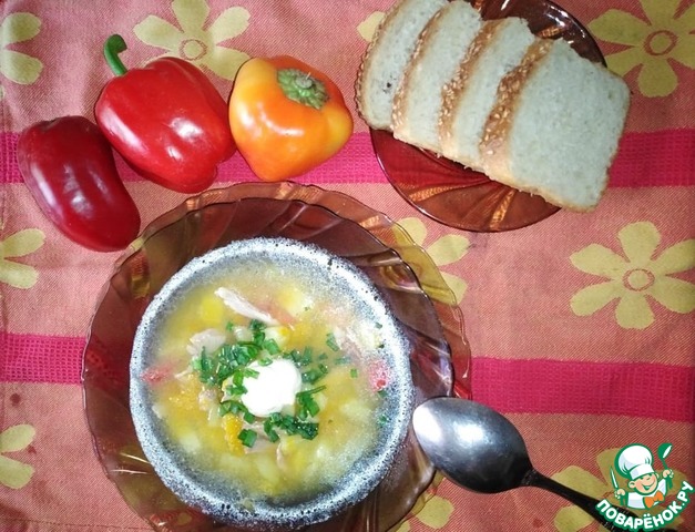 Болгарский перед порежьте соломкой. Добавьте его в суп вместе с кусочками курицы. Проварите еще 10 мин.