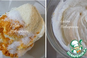 Для начинки смешать мягкий творог, сахар, цедру апельсина, манную крупу.