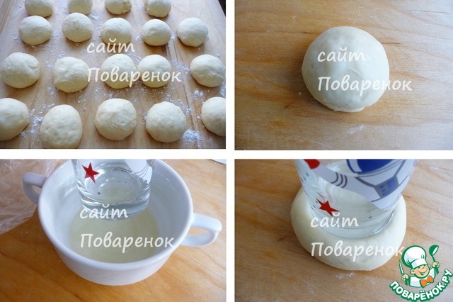 Берем первый шарик, стакан (диам. дна 8см) окунуть в растительное масло, выставить в центр шарика, придавить хорошо. -