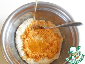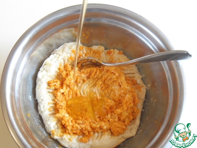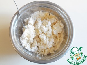 Начинаем замес именно в этой воронке, постепенно захватывая новое количество муки. Вначале вилкой или ложкой, затем руками.