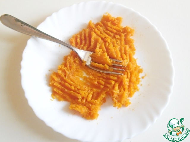 Её я нарезала на кусочки, отварила до мягкости в микроволновой печи затем размяла вилкой. -