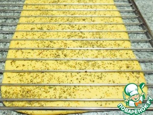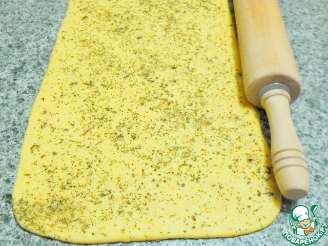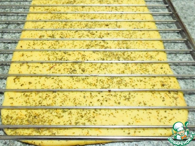 Посыпать сухим базиликом, немного вкатать его скалкой в тесто. -