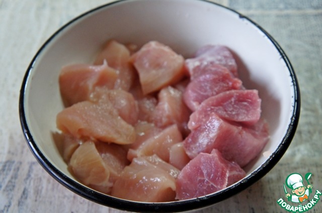 Нарезать курицу и свинину небольшими порционными кусочками. Посолить мясо.