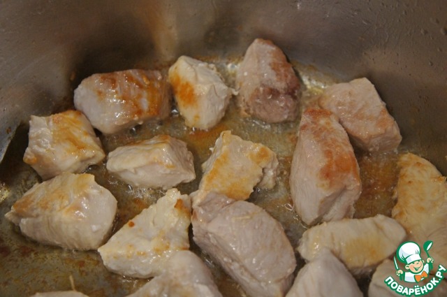 Положить курицу и свинину, обжарить на сильном огне до румяной корочки со всех сторон.