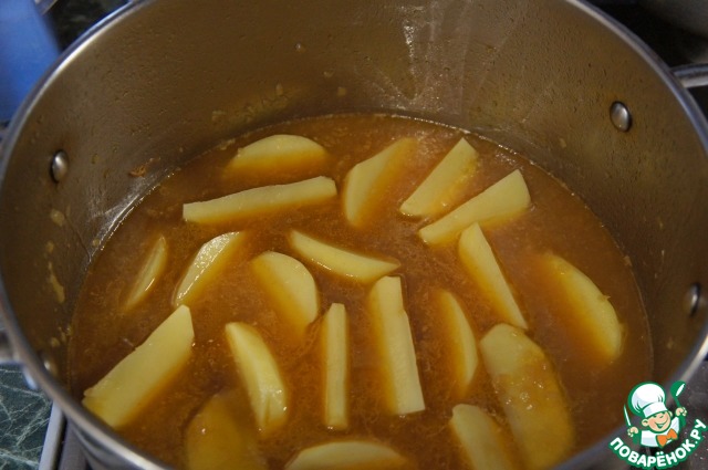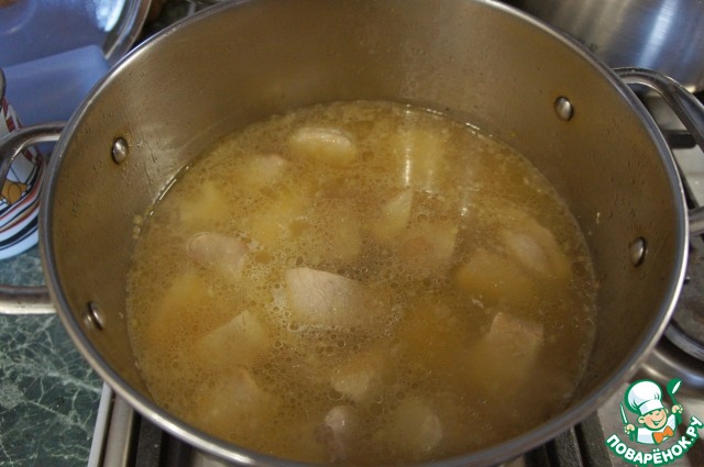 Вынуть все мясо шумовкой из кастрюли в миску, в бульон положить картофель, довести до кипения и варить на маленьком огне 5 минут.