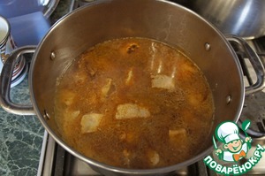 Вернуть мясо в кастрюлю, добавить бульон до нужной вам густоты и довести суп до кипения.