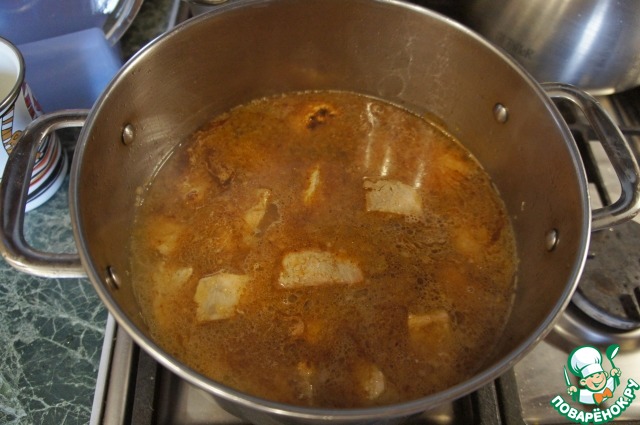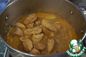 Посыпать мясо паприкой, перемешать и сразу влить столько горячей воды, чтобы мясо было полностью покрыто.