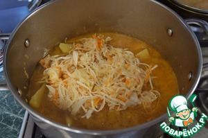 Затем добавить капусту, чеснок, тмин, сахар и соль. Варить до готовности картофеля.