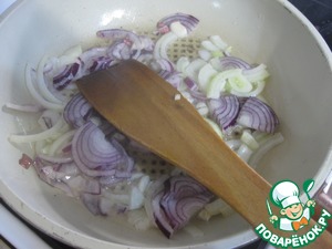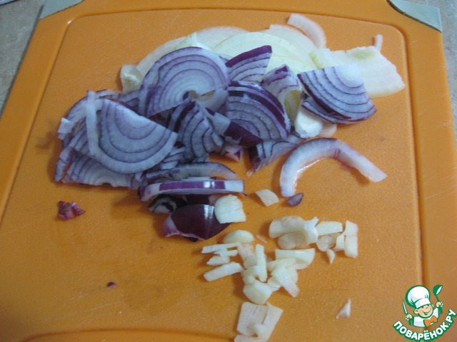 • Лук нарезать полукольцами, чеснок мелким кубиком
