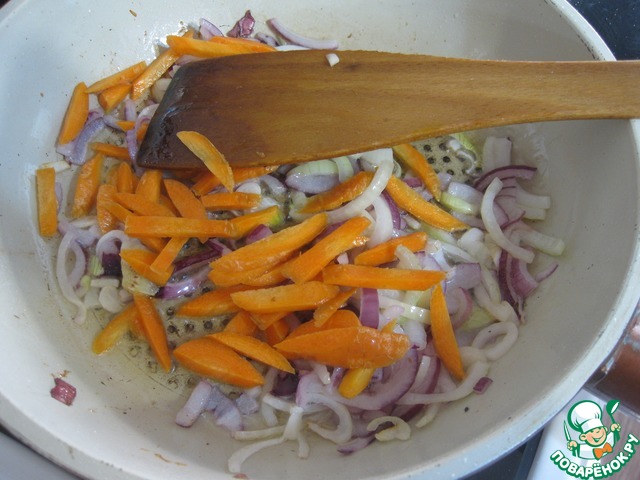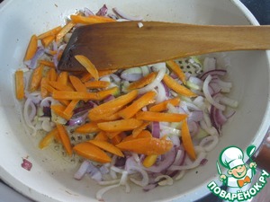 • Добавить морковь нарезанную соломкой, тушить еще минуты 3-4