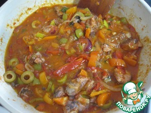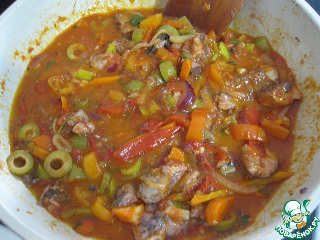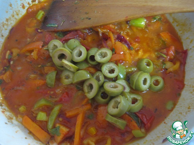 • Добавить оливки, нарезанные колечками и 3-4 ст. л. рассола от оливок