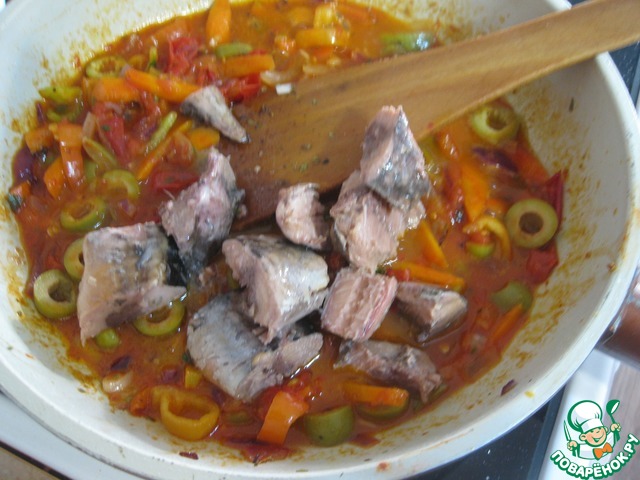 • Немного измельчить, добавить жидкость от консервы и прогреть минуты 2-3