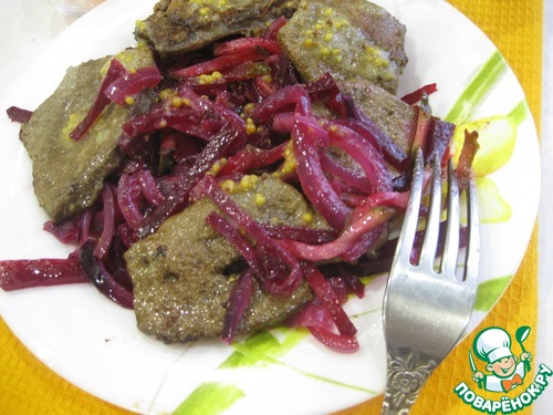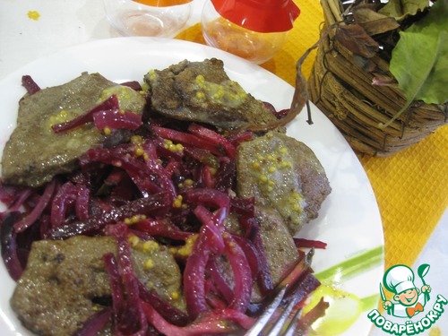 На тарелку выложить овощной салат из свеклы, лука и огурца, приправить по вкусу солью и перцем, поверх уложить кусочки печени и полить заправкой.