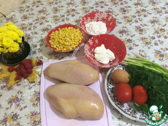 • Добавьте в посуду с курицей яйца, кукурузу, муку, измельчённые помидоры и зелень. Тщательно всё перемешайте.