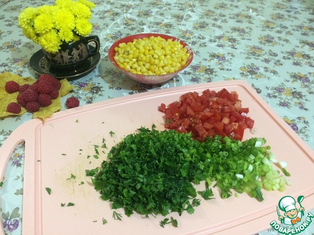 • Измельчите помидор (если небольшие, то лучше взять два), зелень (петрушку, укроп - полпучка), зелёный лук (его тоже можно заменить на репчатый).