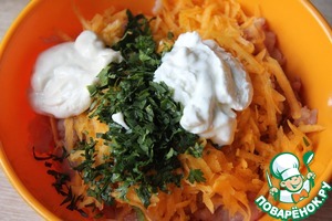 • Добавить мелко рубленную зелень, йогурт и майонез.