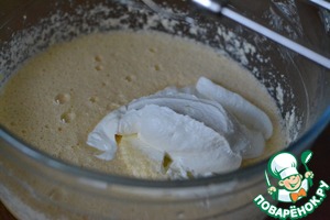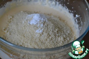 Добавить к жидкой смеси. Добавить разрыхлитель теста. Перемешать. -