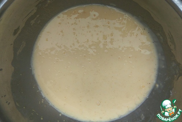 В теплом молоке растворить дрожжи, сахар и 100 г муки. Оставить в теплом месте на 15 минут. -