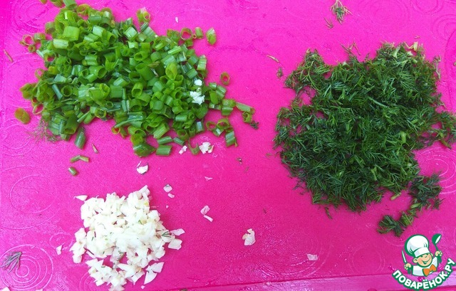 Зелёный лук, укроп и чеснок мелко нарезать. -