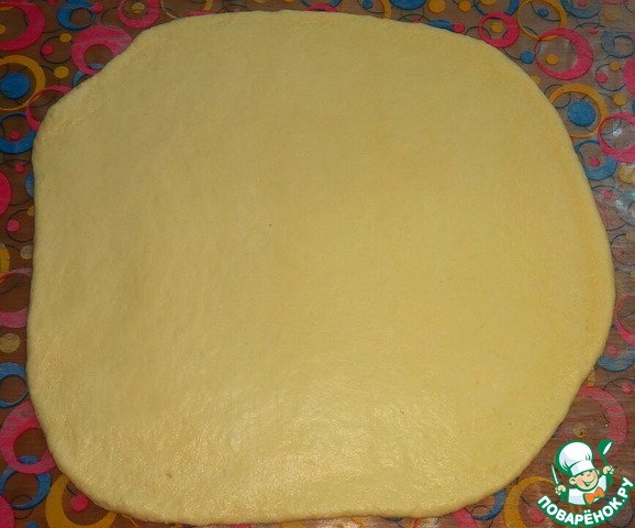 Подошедшее тесто обмять и раскатать в пласт толщиной 3 мм. Мне удобнее разделить тесто на 2 части и раскатывать по отдельности.