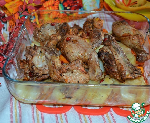 Замариновать куски утки в лимоне и шафране, паприке и смеси перцев, посолить.