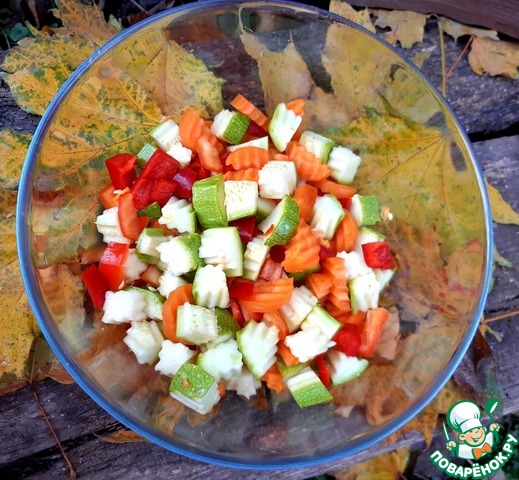 Нарезать сладкий перец, цукини и морковь. Обжарить на сковороде до золотистого цвета.