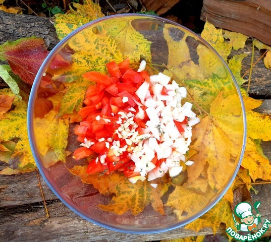 Для томатного соуса нужно нарезать помидор, лук и чеснок. Добавить тимьян.