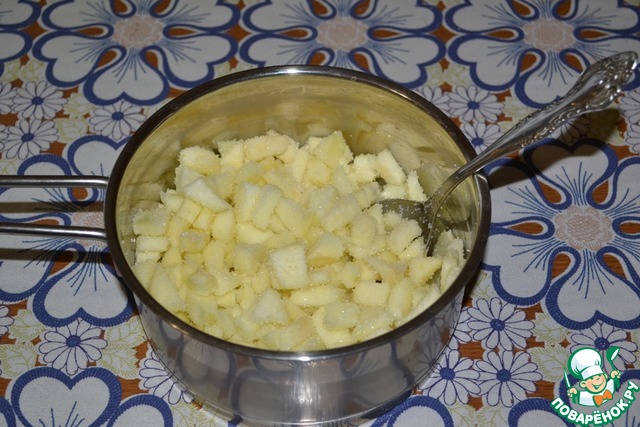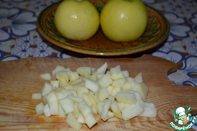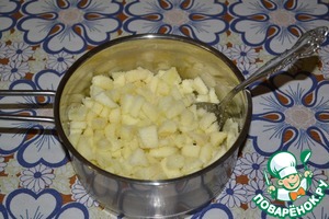 Сначала приготовим начинку: яблоки очистить от серединки и кожуры, порезать кубиками.