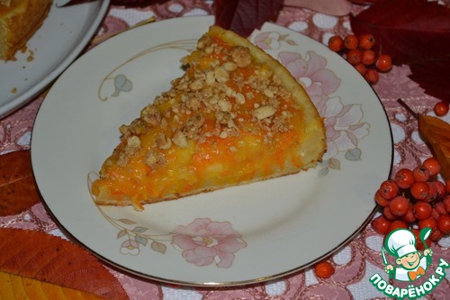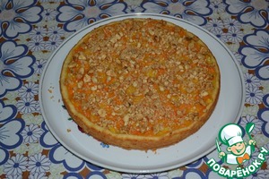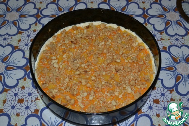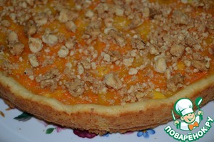 Сверху посыпьте любимыми орешками - тёртым миндалём, дроблёным арахисом или грецкими, как подскажет ваша фантазия. Или сделайте, как я. Возьмите штучки 4 печенки, любые, типа "К чаю" или "С топлёным молоком" и т. д. Разомните их толкушкой и сбрызните небольшим количеством молока, перемешайте и посыпьте сверху пирог. Молока надо немного, чтобы крошка была не сухая, а чуть влажноватая.