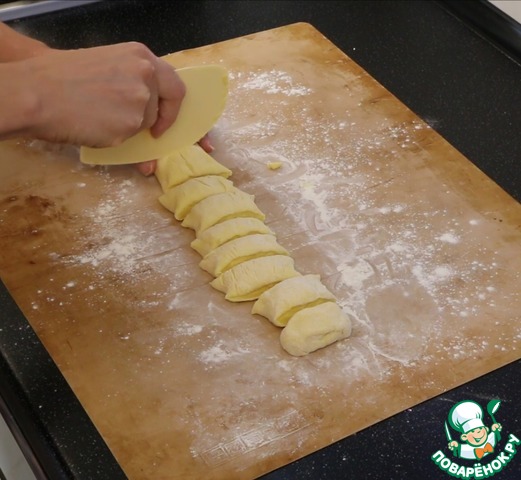 Рабочую поверхность и тесто хорошо припыляю мукой. Раскатываю колбаской и делю на 12 равных частей.