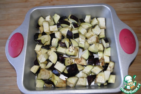 Баклажаны моем, режем кубиками 1 на 1 см, засыпаем солью и отставляем на 20 минут, чтобы вышла горечь. Далее баклажаны смываем, отжимаем и обсушиваем бумажным полотенцем.