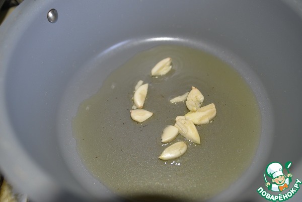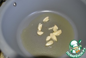 Чеснок чистим, раздавливаем ножом. Берём сотейник или кастрюлю с толстым дном, разогреваем масло, кладём чеснок.