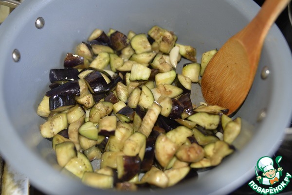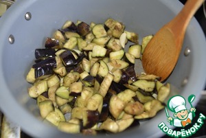 Как только появляется аромат чеснока, кладём в кастрюлю баклажаны и обжариваем, постоянно помешивая 5 минут. Убираем баклажаны на тарелку.