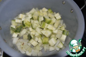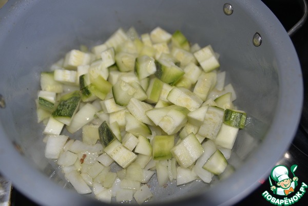Лук и цуккини моем, чистим и режем такими же кубиками, как и баклажаны. Добавляем в кастрюлю масло, обжариваем пару минут лук, далее добавляем цуккини и обжариваем всё на среднем огне 5 минут.