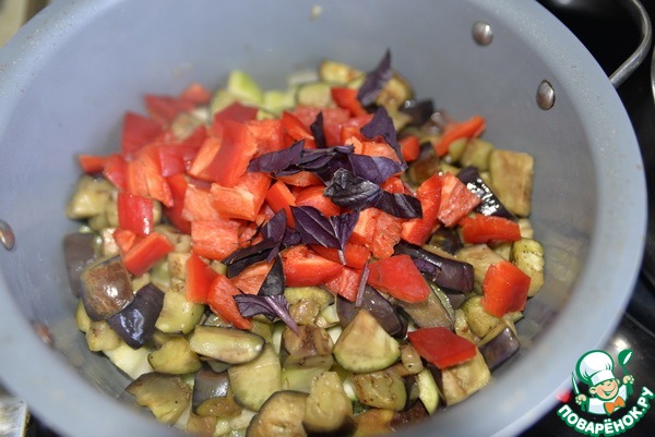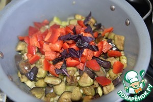 Добавляем к цуккини обжаренные баклажаны, кладём порезанный кубиками болгарский перец, перемешиваем. Добавляем зелень, по рецепту - листики тимьяна, я заменила на базилик.