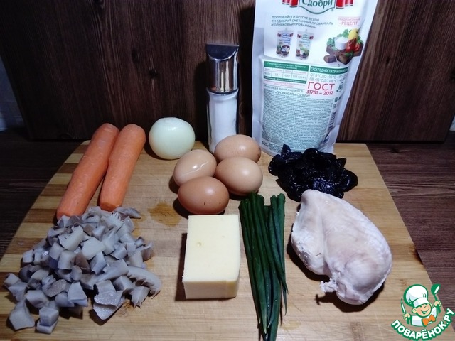 1. Подготавливаем продукты. Яйца и куриную грудку отвариваем. Лук и морковь очищаем. Чернослив заливаем кипятком и оставляем на - 10 минут.