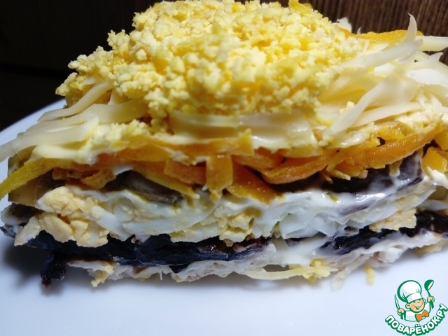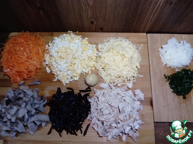 2. Нарезаем куриную грудку, чернослив, грибы, зелёный и репчатый лук. Яйца, морковь и сыр натираем на крупной тёрке (один желток можно оставить на украшение)